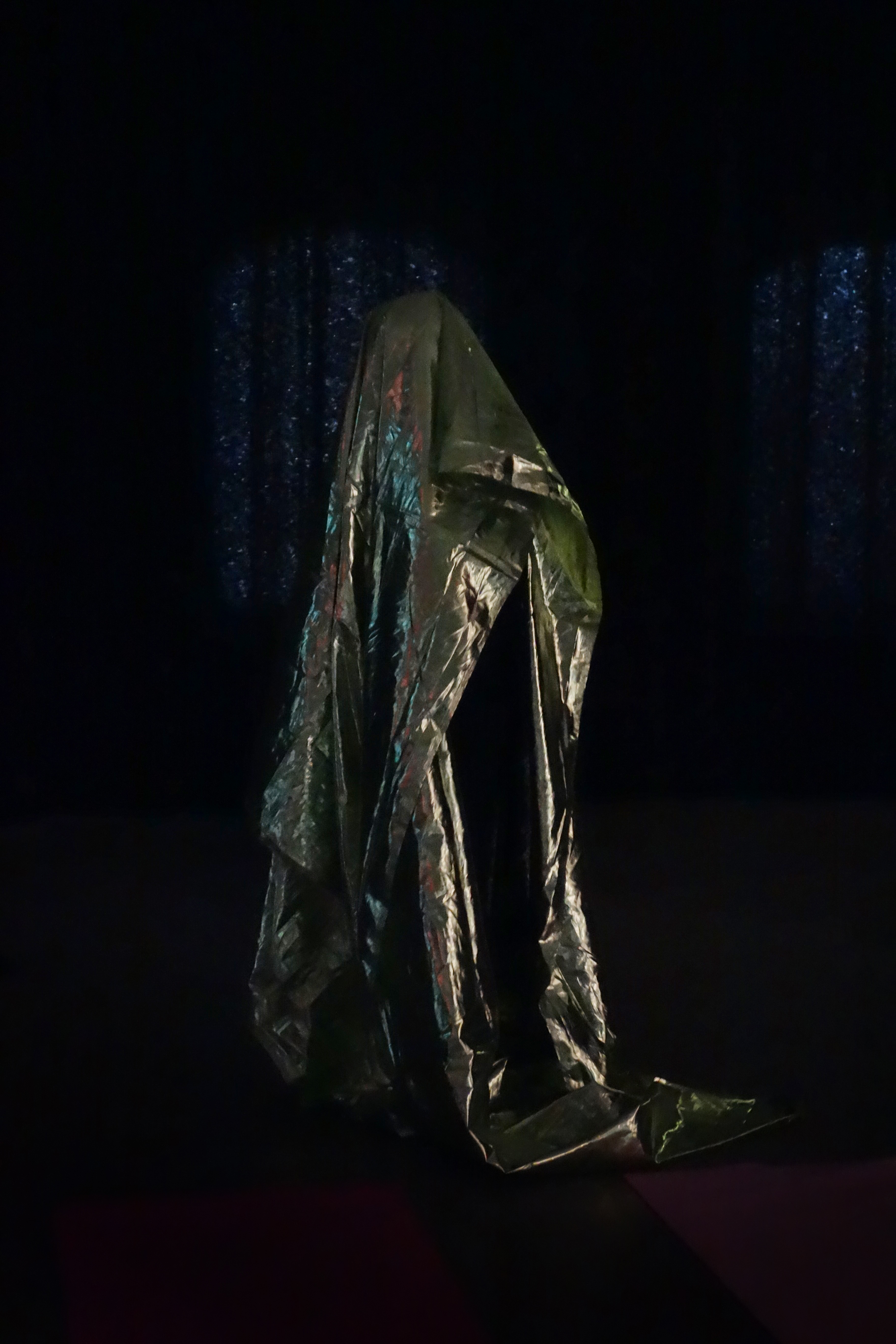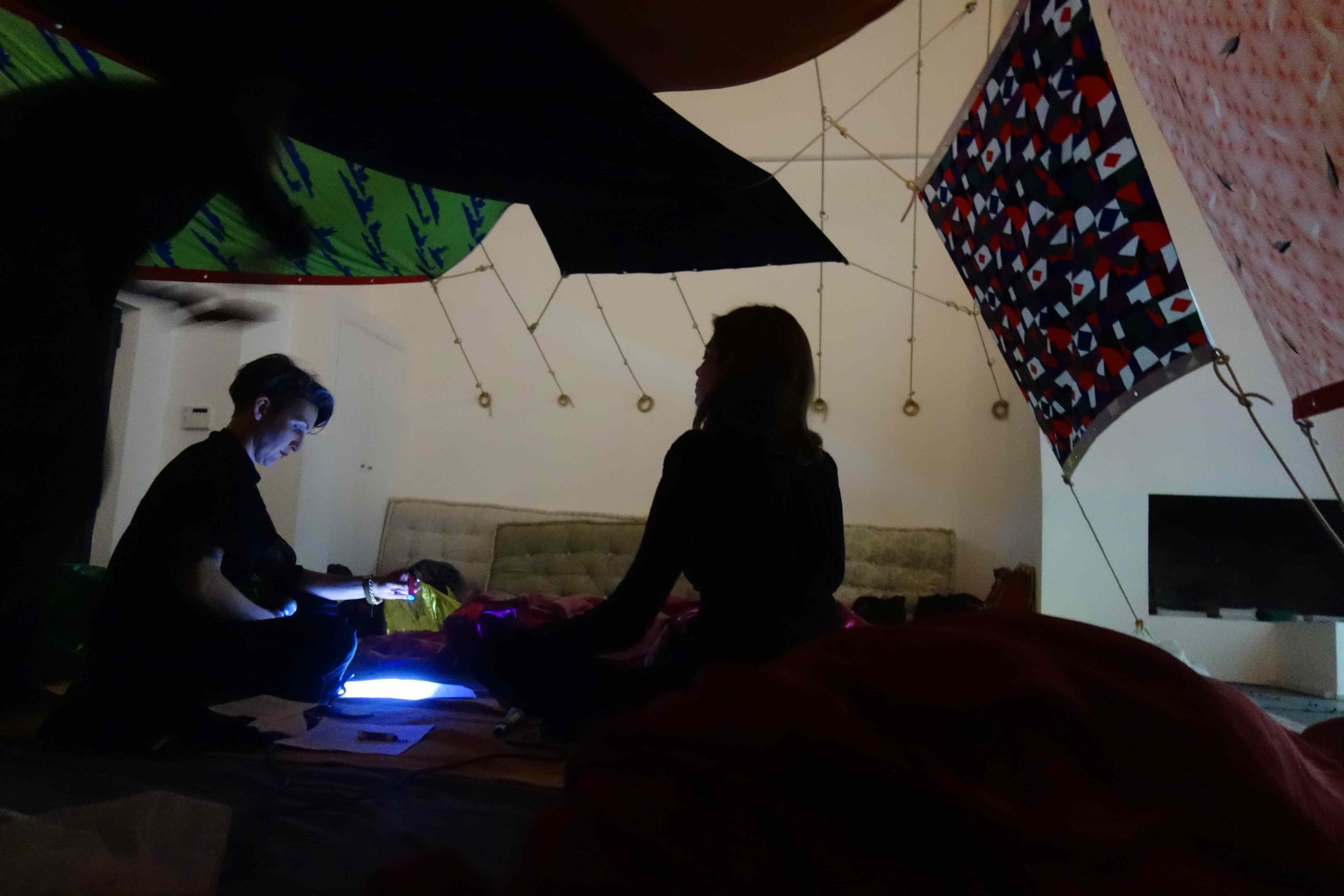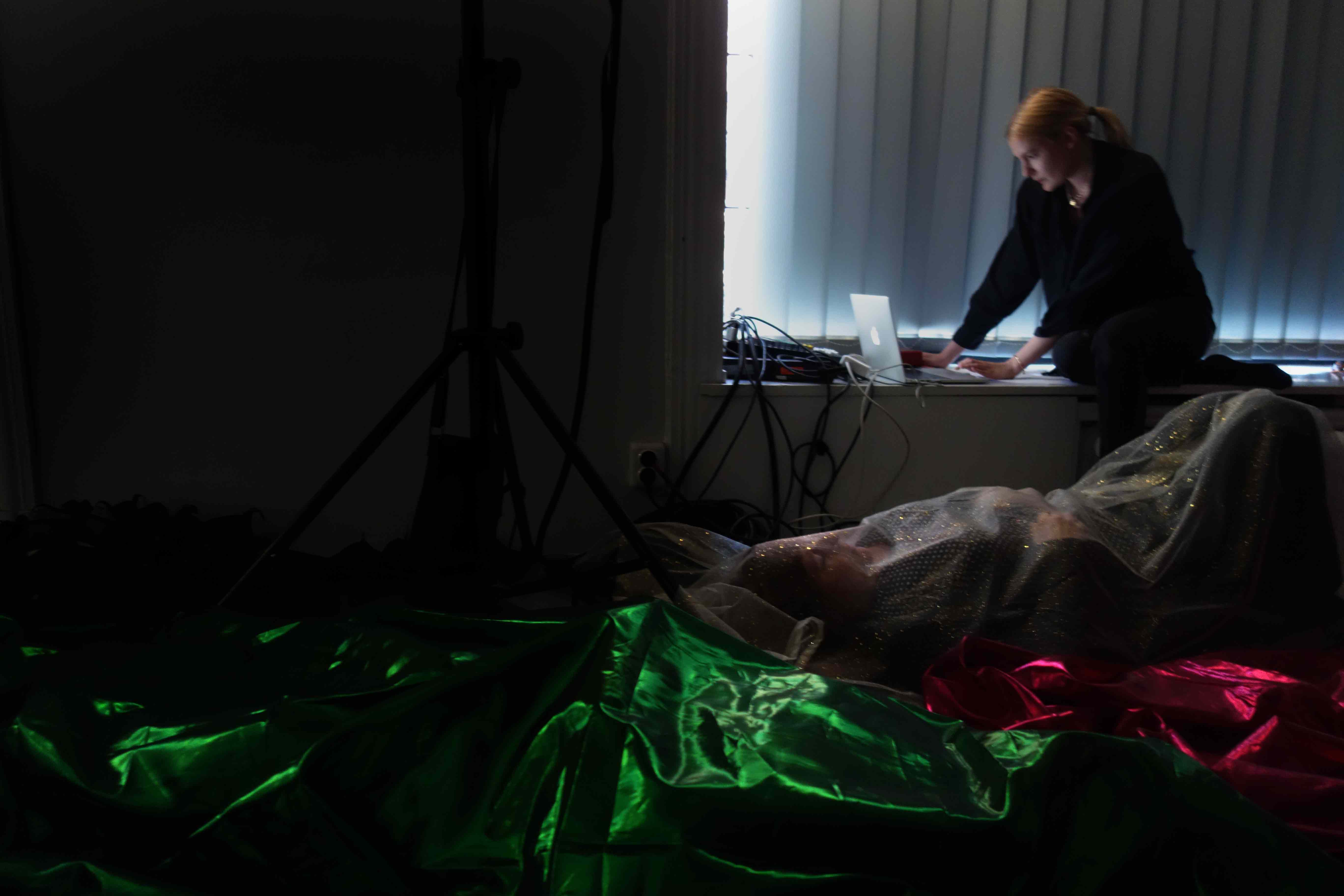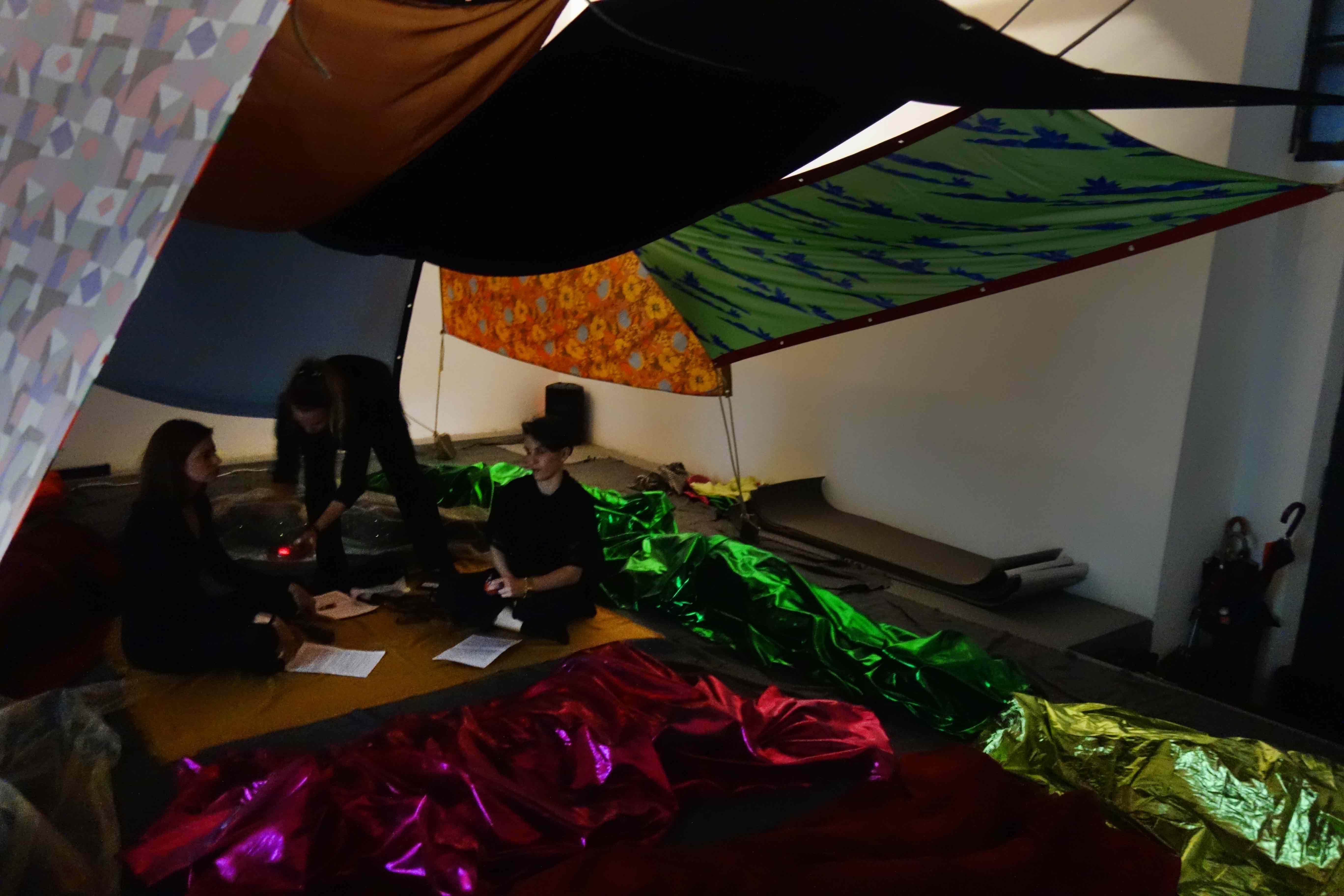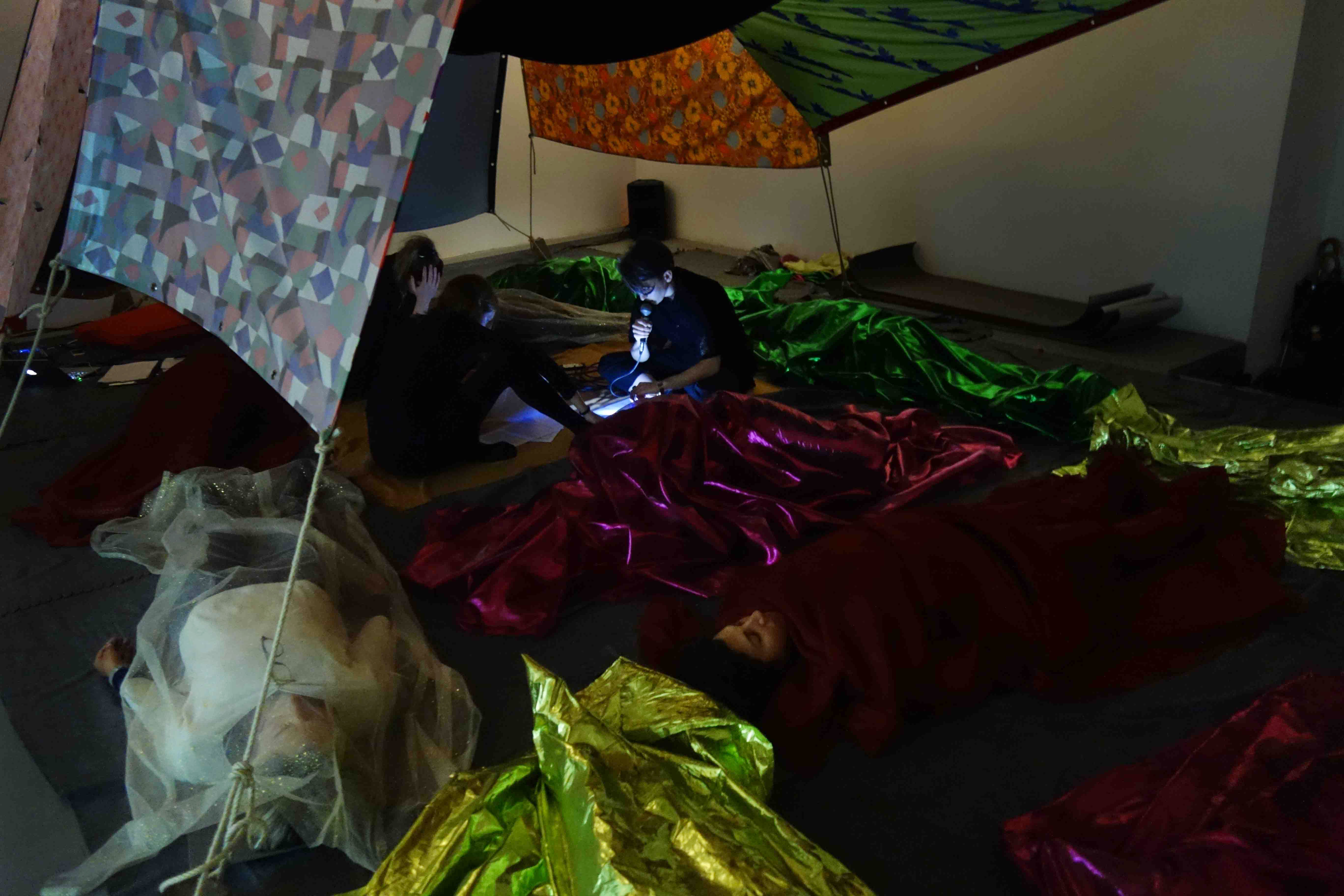 Start in the Middle is a participatory event that brings together visual art, dance and music. It uses the formats of lecture and meditation into a seamless whole. The two performers use texts (voice) sounds, lights and contemplative exercises for the audience to participate in a collective journey. The audience spend most of the performance lying on the floor with their eyes closed, listening to music and texts, while their bodies are covered by semi transparent fabrics.
